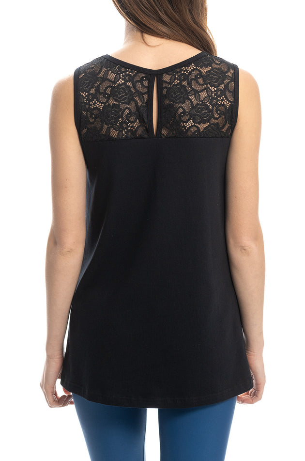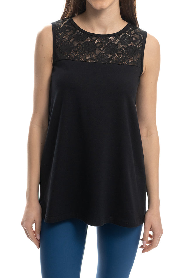 Усетете уникалния комфорт и стил с нашия черен потник от памук, украсен с дантела на предната част и на гърба. Този потник е изработен от висок процент памук, материал, известен със своите изключителни дишащи свойства и удобство за носене. Памучната тъкан е мека, гъвкава и нежна към кожата, което я прави идеална за горещите летни дни.