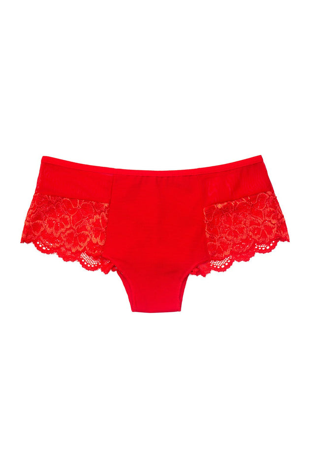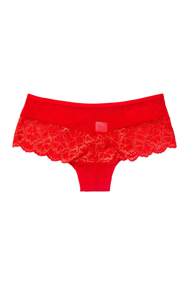 Червената бразилиана, с дантела и тюл, е изискан и елегантен избор за всяка жена. Тя е обточена с ластично бие на талията, което позволява да се пасне перфектно към тялото. Панелите от дантела и тюл придават на бразилианата изтънчен и модерен вид.